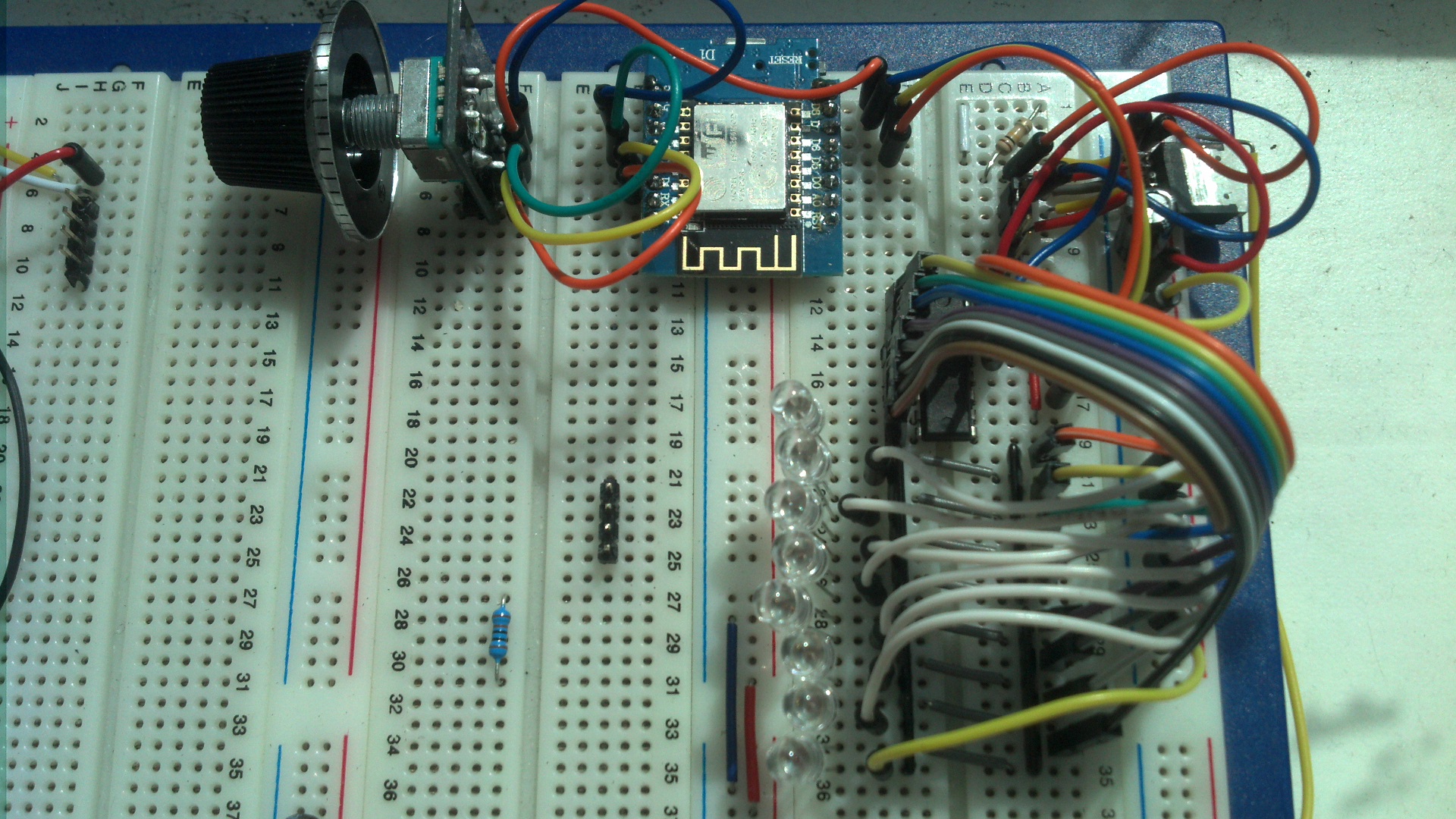 Mým cílem je sestavit hračku pro syna a naučit se pracovat s kaskádou posuvných registrů. Původně mělo být jen několik LED a jedna RGB LEDka s rotačním enkodérem, kterým se se řídilo 8 LED diod, změny barvy RGB LEDky a zároveň přepínaly efekty s PWM modulací. Všechny GPIO piny ESP8266 podporují PWM modulaci. GPIO linek však není dostatek a dost jich obsazuje rotační enkodér. Řešením se zdál posuvný registr. Ten však neumí PWM modulaci :) Součástky, které toto umí řešit jsou pro mne zas zbytečně složité.